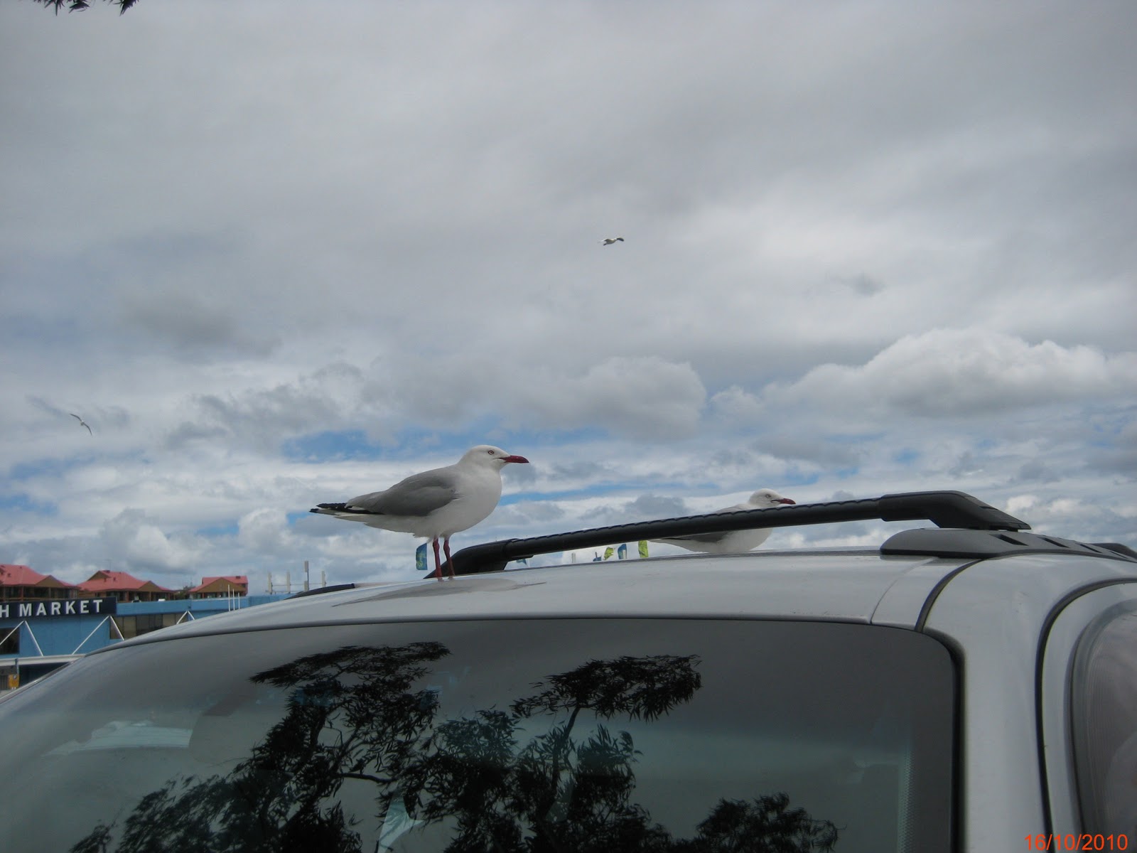 chú hải âu đang dừng trên nóc xe đầu ngó nghiêng ngó dọc như muốn du khách nhìn cái bảng Sydney Fish Market cho biết kẻo lát nửa đây vì vội vả ra về sẽ không nhớ để ngoái cổ nhìn (đậu xe phải trả tiền ... đi dạo kết hợp ăn uống, mua sắm thì đâu có nhanh... mà lâu thì hao... nên đi vô thì từ từ mà đi ra thì như chạy... hì..hì..)
