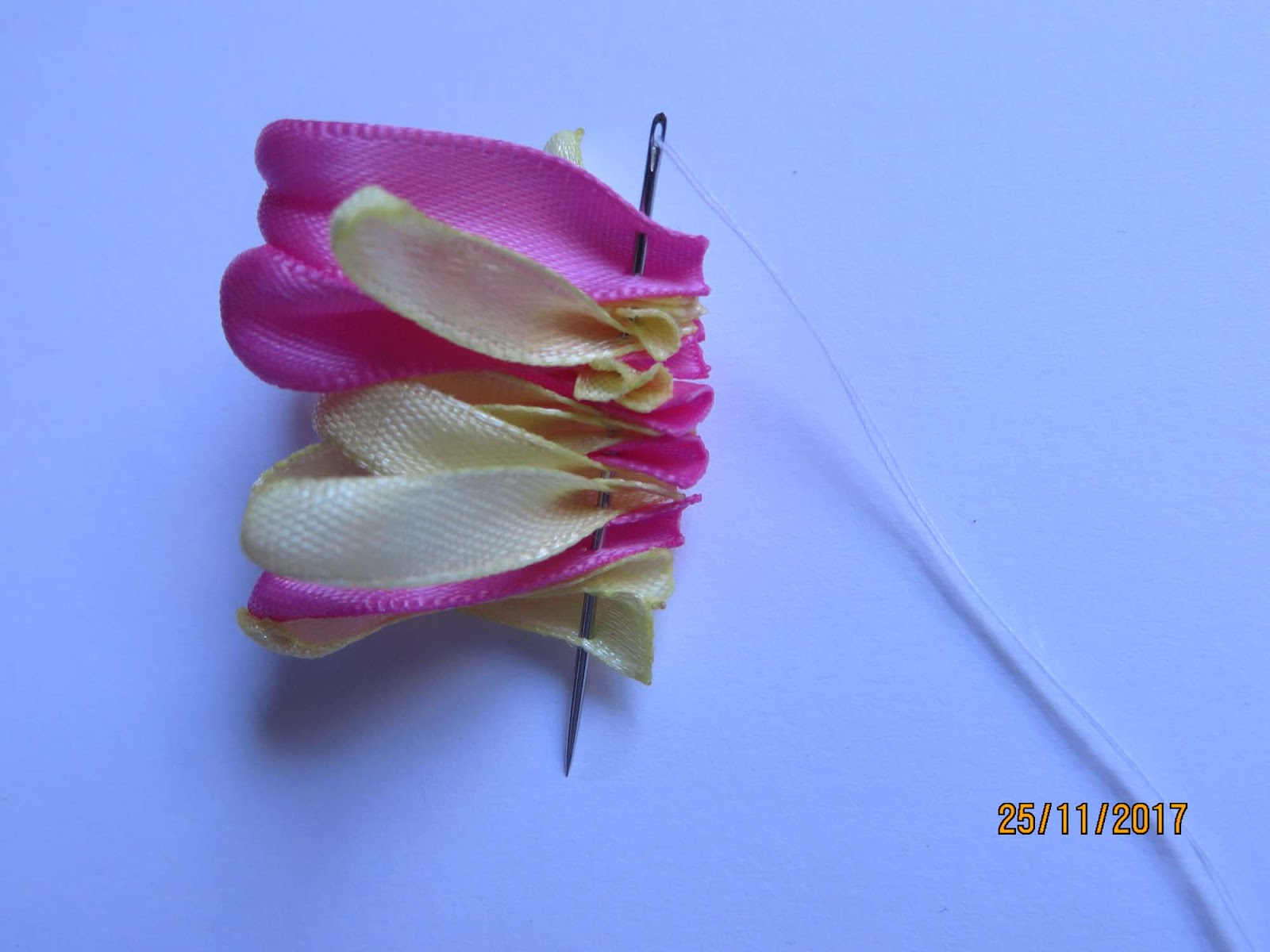 Gập đôi phần tâm nhụy > xiên kim từng cánh hoa khác màu (chỉ 2 màu -trắng và hồng)
